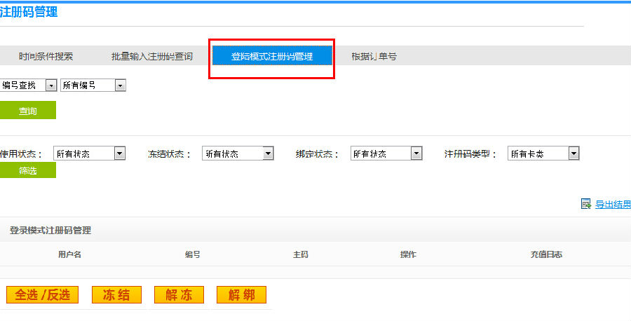 进入“注册码管理”界面,可以看见一个下拉框,点击下拉框然后选择“登录模式注册码管理”